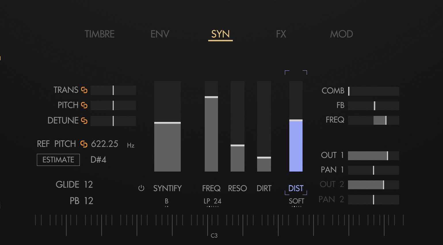 Bei SYN stellt man die Tonhöhe des Audiomaterials ein. Praktisch hier: hat man per Drag-And-Drop ein Sample geladen, dessen Tonhöhe man nicht kennt, kann man Novum über den Button „Estimate“ die Tonhöhe erkennen lassen. Dazu gibt es in Tracktion Novum ein Filter (LP24, LP12, HP24, HP12, BP24, BP12) mit Cutoff, Resonance und zwei Distortion-Einheiten. Und eine weitere Besonderheit: Syntify. Laut Dawesome-Kopf Peter Vorlaender so etwas wie ein umgekehrtes Filter. Damit werden keine Obertöne gedämpft, sondern erzeugt.