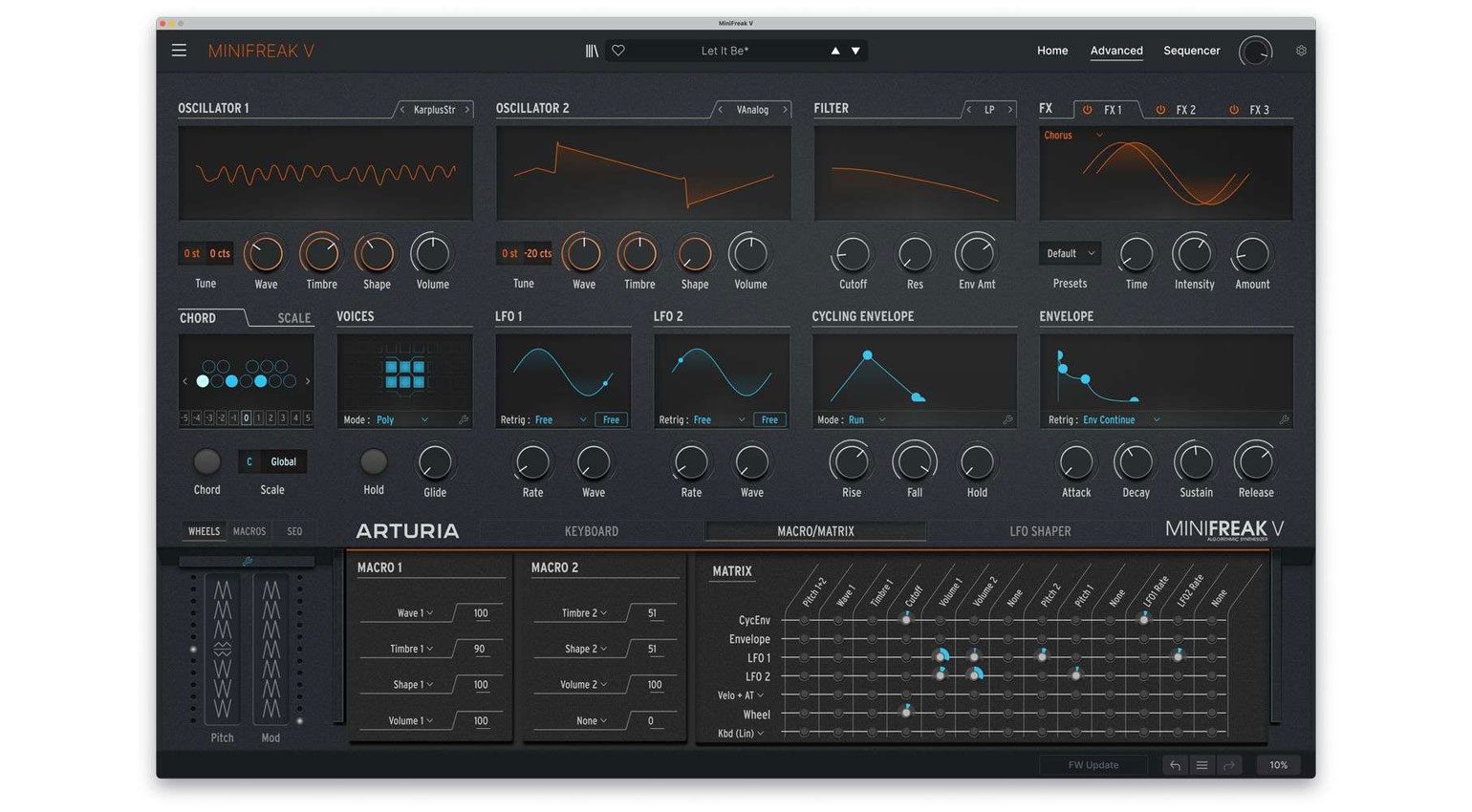 Laut Arturia ist der Software-Synthesizer ein exaktes Abbild der Hardware-Version. Die beiden Oszillatoren verfügen über dieselben 22 Modi wie die Hardware. Die analogen Filter hat der Hersteller laut eigener Aussage für den MiniFreak V detailliert emuliert, um den hybriden Charakter des Synthesizers zu bewahren. Auch der Rest der Klangerzeugung ist ein exaktes Spiegelbild der Hardware – bis hin zu den Modulationsmöglichkeiten und der Kombination aus Sequencer und Arpeggiator.
