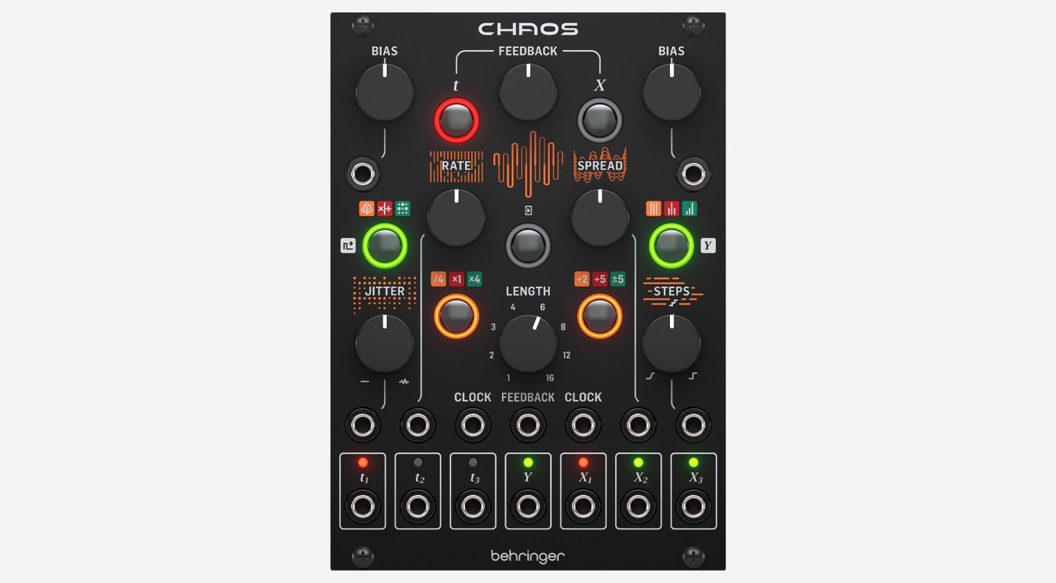 Wie Marbles ist Chaos ein Analogmodul, das sich hauptsächlich als Quelle zufälliger Gates und Spannungen anbietet. Die Sektion t erzeugt zufällige Gates und Rhythmen in Abhängigkeit von einer Master-Clock, die über drei Gate-Ausgänge ausgegeben werden. Drei verschiedene Modi stehen zur Auswahl. Beeinflussen kann man das über die Parameter Rate, Bias und Jitter, die alle CV-steuerbar sind.