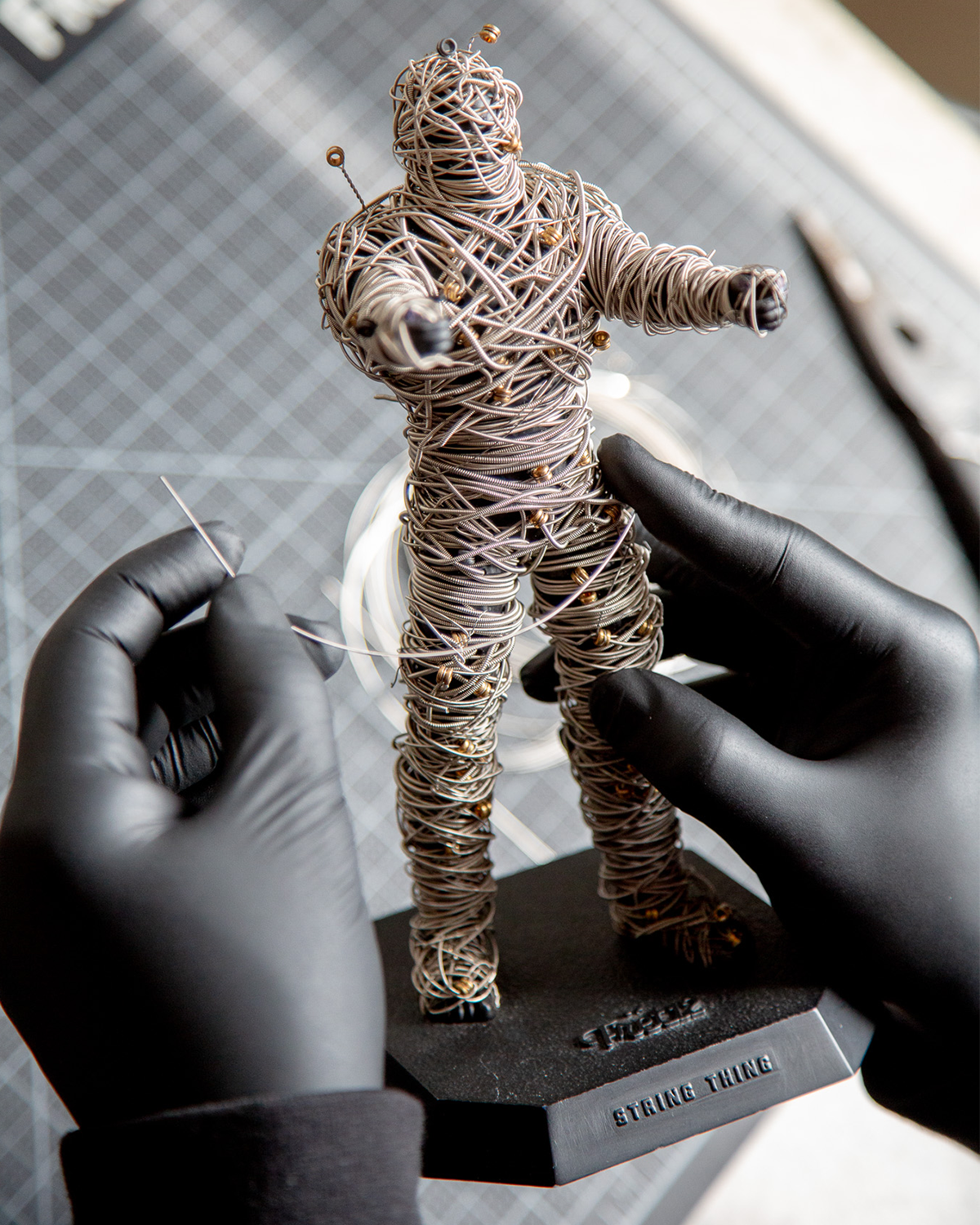 Die Idee stammt von Dan Tremonti, dem Bruder des Creed- und Alter-Bridge-Gitarristen Mark Tremonti. Das String Thing ist im Stil einer Mumie aus klassischen Horrorfilmen gestaltet und mit zahlreichen Löchern versehen. Dort könnt ihr gerissene oder totgespielte Saiten befestigen und um die Figur wickeln.
