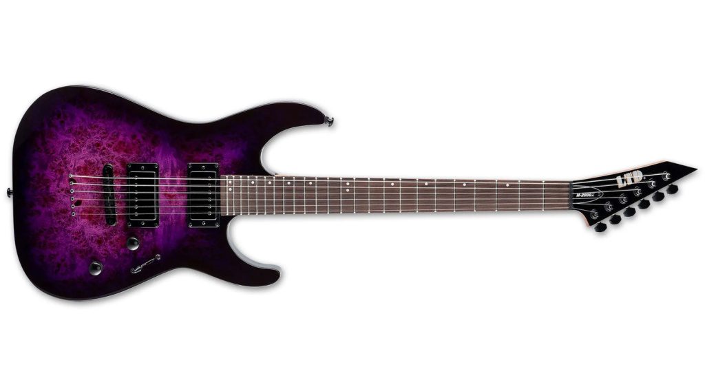 Farblich setzt man bei den beiden Modellen LTD M-200DX auf die Finishes Blue Burst und Purple Burst. Basierend auf der M-Korpus-Form von ESP, kommen wir hier auf eine etwas längere Mensur von 25,5 Zoll (648 mm). Bei der Decke hat ESP in diesem Fall eine Pappel-Maser-Decke verbaut, dazu eine TOM-Bridge samt String-Thru-Body-Design.