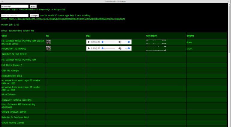 Die Entwickler bei Azorp Corp. kommen aus diesem Grund mit einer Lösung um die Ecke. Denn ihr Tool SCbackup zieht alle eure Soundcloud Titel aus der Cloud auf euren Rechner. Und das sogar mit den zugewiesenen Bildern, der Wellenform-Datei und der Original-Datei, falls der Besitzer es autorisiert hat.