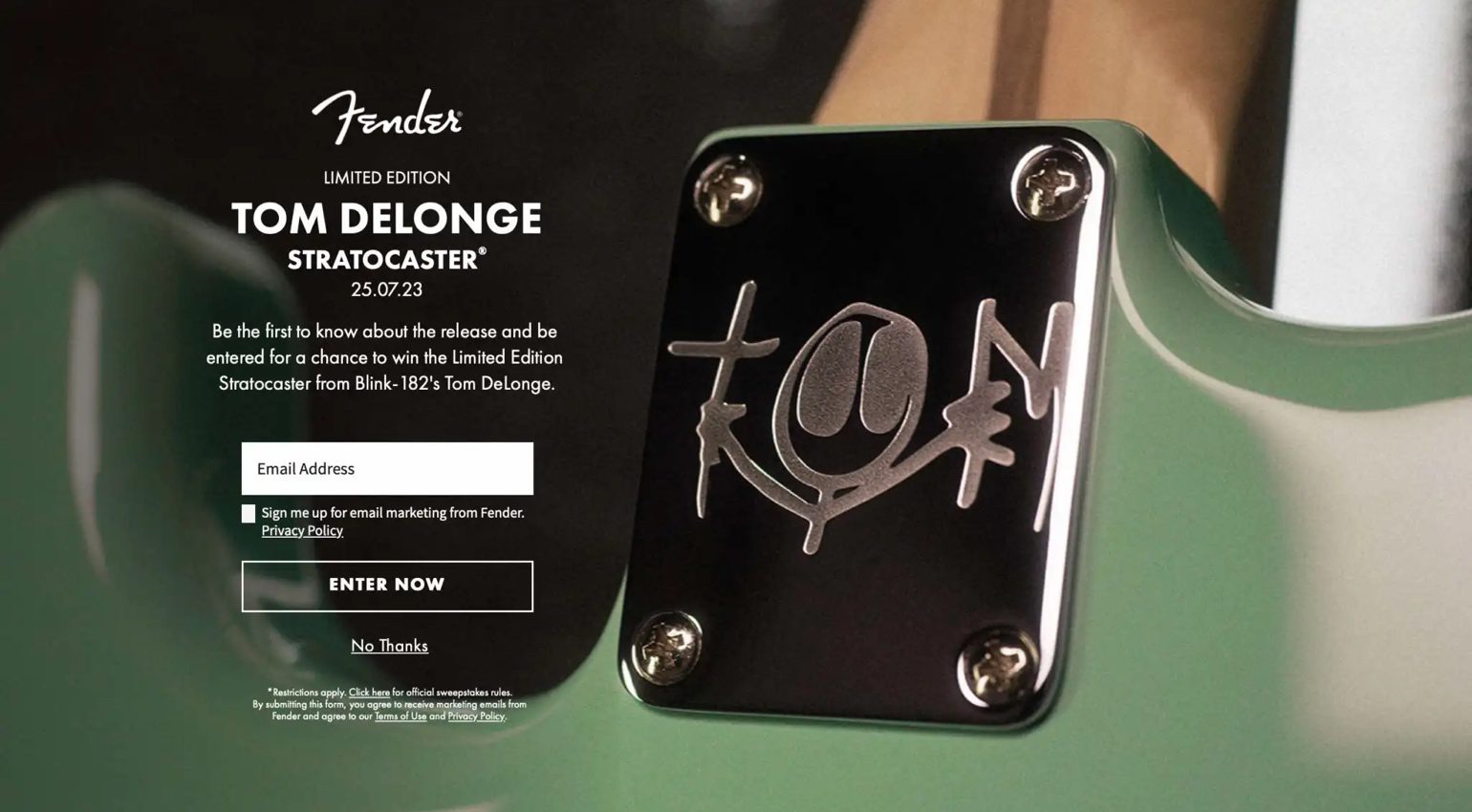 In den vergangenen Tagen hatte Fender die Neuveröffentlichung der Tom DeLonge Stratocaster bereist angeteast. So tauchte die Produktseite bei Fender auf, inklusive einer Verlosung. Und auf ihrem Instagram-Kanal stellte DeLonge höchstpersönlich seine neue Strat vor.