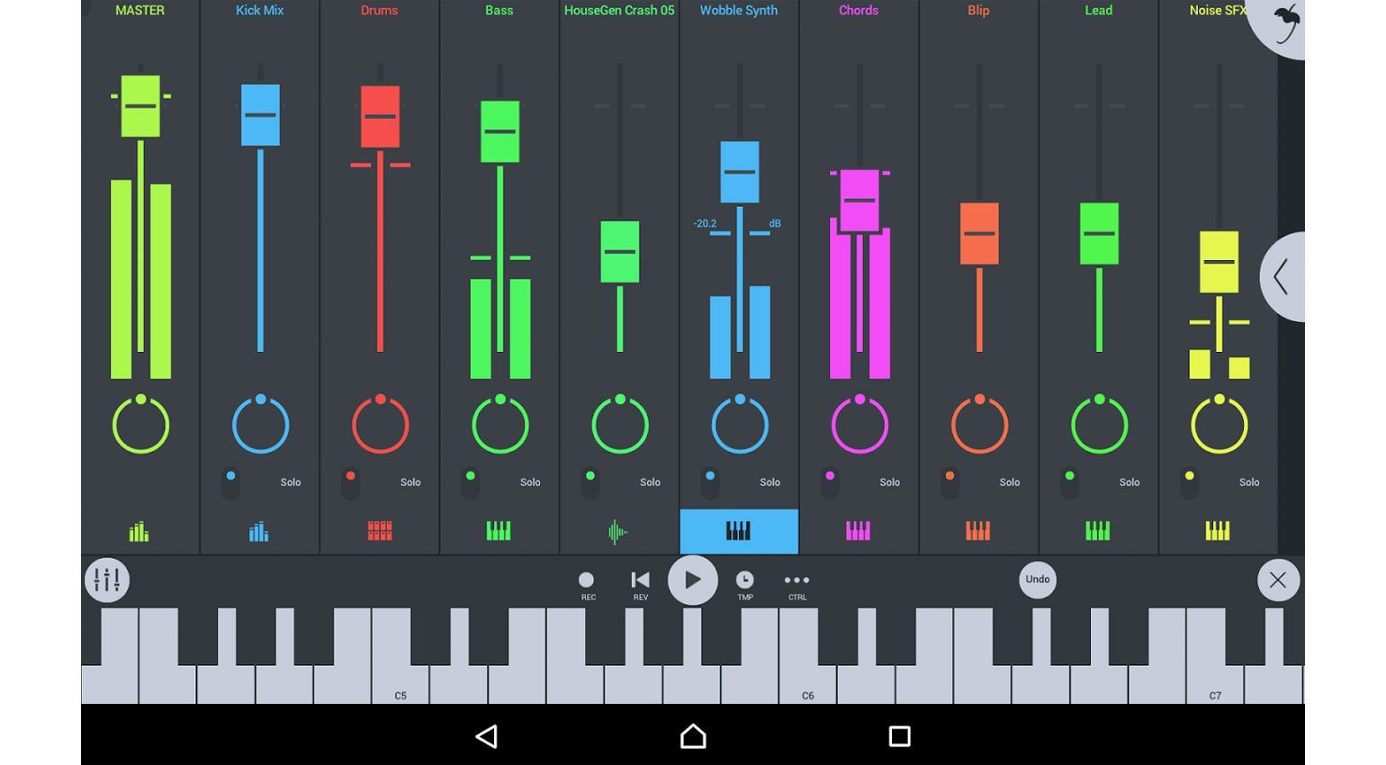 Neben der frischen Track-Ansicht mit mehr (grellen) Farben und ausklappbaren Steuerfunktionen bekommt man auch wieder den Step-Sequencer, Drum Pads und einen Piano Roll Editor für MIDI „Noten“. Als Instrumente stehen Synthesizer, Sampler, Drum Kits und Loops bereit, die alle über den Touchbildschirm, die ausklappbare Klaviatur und externe MIDI Controller gesteuert werden können. Neu ist auch die Aufteilung auf dem Bildschirm: Es wird nicht mehr in Tabs wie im Internetbrowser durch die Funktionen und Instrumente geswappt, sondern fortan im Split-Screen.