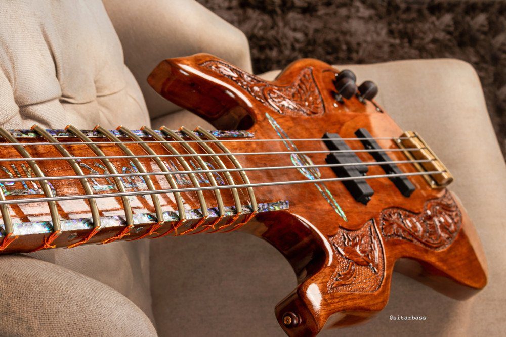 Sachen gibt’s! Der sogenannte Sitar Bass von Miles Schelling ist auf jeden Fall „einzigartig“. Es gibt nur eine Handvoll diser Instrumente, jedes mit eigener Schnitzerei. Der Korpus wurde wohl von einem indischen Sitarbauer in 6. Generation hergestellt. Der Hals ist leicht hohl und die Saiten und Bünde sorgen dafür, dass man die Töne sehr gut ziehen kann.