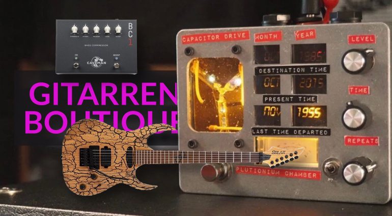 Heute in der Gitarren-Boutique: der neue Caveman Audio BC1 Bass Compressor, Solar Guitars Chop Shop Blitz mit „1000 Volt-Finish“, der Old Blood Noise Endeavors BL-37 Reverb und das Spürr Audio Time Traveler Delay mit waschechter Zurück-in-die-Zukunft-Optik.
