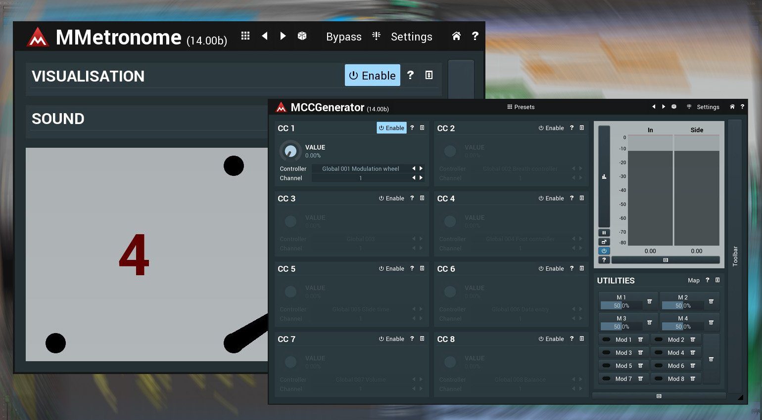 Das Zweite im Bunde ist MCCGenerator. Hiermit lassen sich bis zu acht MIDI-CC-Werte frei festlegen, mit denen ihr dann andere Plug-ins steuern könnt. Es lassen sich sogar eigene Modulatoren mit den Slots verbinden. Hier steht euch ein LFO, Level-Follower, ADSR-Enveloper, Zufallsgenerator, Pitch-Detector und ein Sidechain-Eingang zur Verfügung. Eine schöne Modulationsmatrix für MIDI-Anwendungen. Und zwei interessante Tools für unseren DAW-Werkzeugkasten.