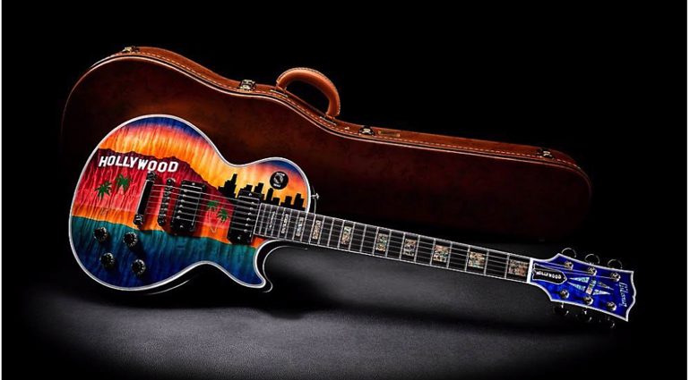 Nur vier Modelle wird es von dieser sehr limitierten Les Paul geben. Jede wurde von Hand vom Custom Sho Künstler Darron Dubose bemalt bzw. lackiert – mit der Skyline von Hollywood, allerdings ohne den ikonischen Schriftzug.