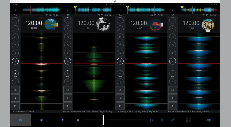 iMect DJ Player Professional bietet euch insgesamt 4 Decks zum Auflegen mit frequenzcolorierten, zoombaren Wellenformansichten. Hier stehen verschiedene Layouts und eine Stem-Ansicht zur Verfügung, außerdem wird Cover-Art angezeigt.