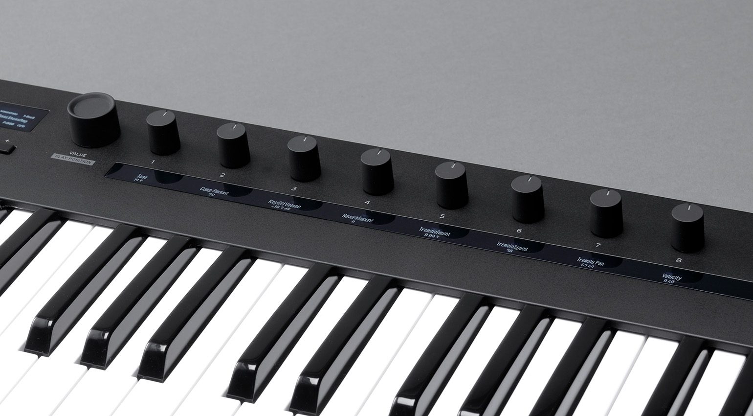Das Korg Keystage verfügt über 49 oder 61 leicht gewichtete, normal große Tasten mit polyphonem Aftertouch. Außerdem bietet der Controller zwei Räder für Pitchbend und Modulation sowie acht zuweisbare Encoder. Neben einem Haupt-Display sind acht einzelne OLED-Displays für die Drehencoder verbaut, sodass die jeweils gesteuerten Parameternamen direkt angezeigt werden können.