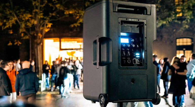 Für Mobilität sorgt das Design mit Rollen und Teleskopgriff – praktisch beim Transport. Und der PA-Lautsprecher kann über den 35-mm-Flansch problemlos auf Stative gebracht werden. Praxisnah ist auch das Hot-Swap-Akkusystem: Bis zu vier Akkus lassen sich verwenden und ohne Unterbrechung des Betriebs wechseln. Im energiesparenden ECO-Modus sind Laufzeiten von bis zu 50 Stunden Betrieb realisierbar, während bei voller Leistung etwa fünf Stunden machbar sind.