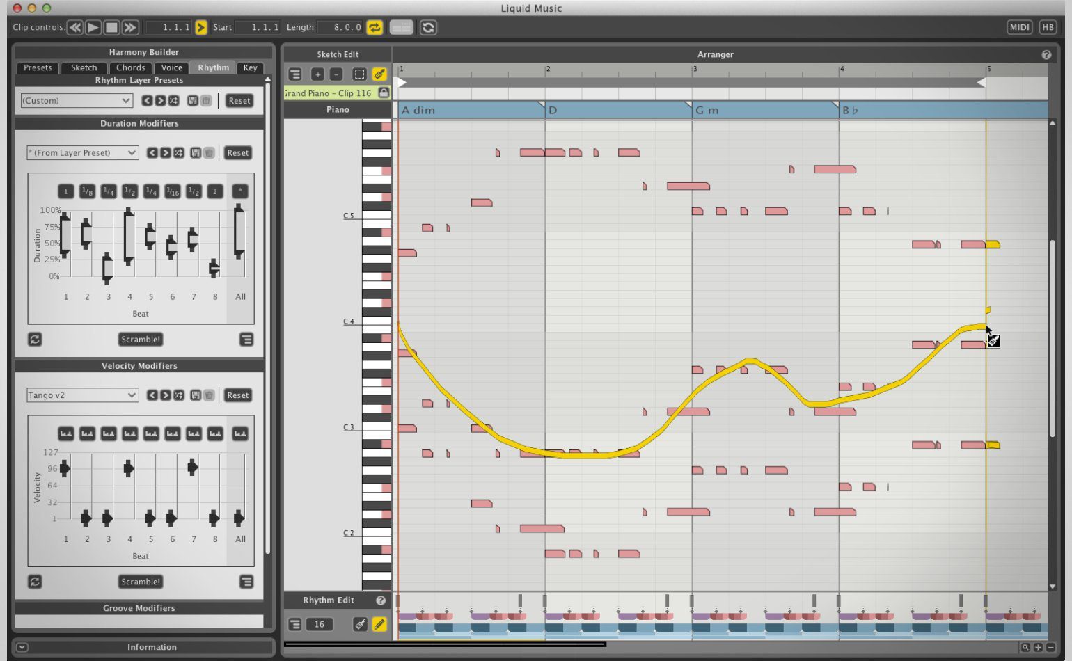 Als Weiterentwicklung dieses Tools folgte Liquid Music. Leider setzen die Entwickler nur noch auf eine Anbindung an Ableton Live 9 über Cycling 74 Max. Nach dem Laden des Max4Live Plug-ins in eine MIDI-Spur der DAW wird die Software gestartet. Durch ein Umschalten der Oberfläche komme ich von der gewohnten Rhythmus-Seite zur Music-Ansicht. Hier kann ich durch eigene Vorgaben oder den mitgelieferten Presets Harmonieverläufe erzeugen und mit einem Pinsel in die Pianorolle einzeichnen. Komplette mehrstimmige Akkorde werden sichtbar, die, wie soll es anders sein, natürlich zur Vorgabe, also harmonisch passen. Nachträgliches Bearbeiten und Verschieben einzelner Passagen, aber auch Harmonien, ist ebenfalls möglich. Interessant finde ich den Arpeggio Modus, denn hier werden Melodienlinien erzeugt, die selten mit Sequencern oder in Synthesizern integrierten Arpeggiatoren realisierbar sind. Rhythmische Variationen des Melodienkonstrukts setzen dem Ganzen die Krone auf. Mir macht es sehr viel Spaß, dieses Tool einzusetzen, um auf neue kreative Ideen zu kommen. Antesten kann es jeder mit einer 30-tägigen voll funktionsfähigen Demoversion beider Programme.