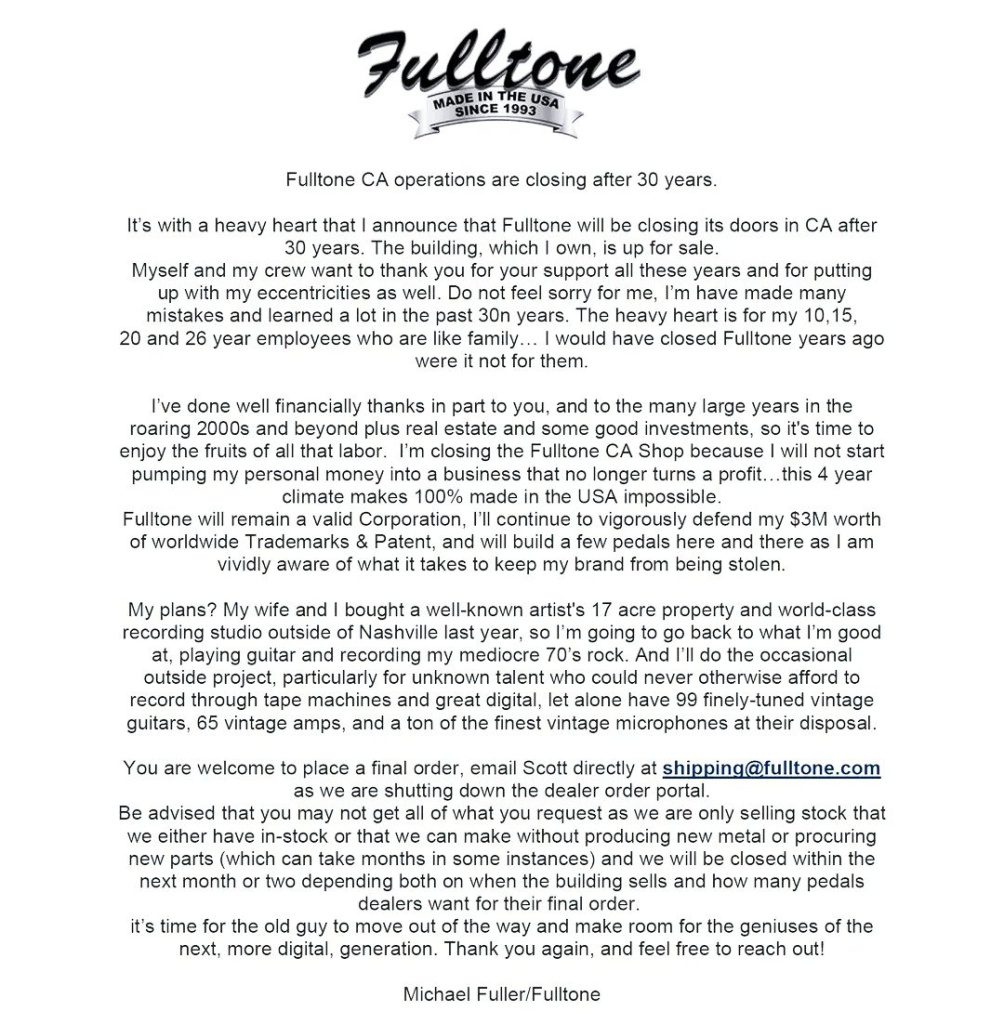 It’s with a heavy heart that I announce that Fulltone will be closing its doors in CA after 30 years. The building, which I own, is up for sale.