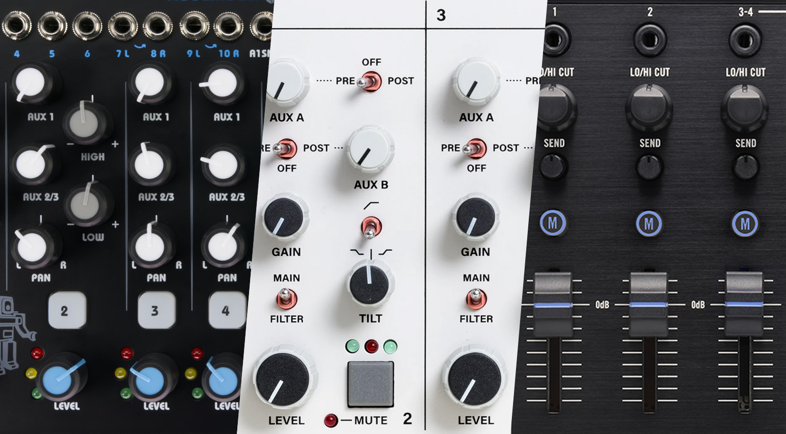 Statt der voll ausgestatteten Kanalzüge herkömmlicher Mischpulte mit parametrischem EQ, Kompressor und mehreren Aux-Wegen haben die meisten Performance-Mixer für Synthesizer eine eher rudimentäre Ausstattung. Zum Beispiel ist die Klangregelung, sofern überhaupt vorhanden, oft als simpler Tilt-EQ ausgeführt, der ein schnelles Ausbalancieren der Bässe und Höhen ermöglicht. Und da kaum ein elektronischer Live-Performer einen kompletten Monitormix mit mehreren Monitorwegen machen muss, gibt es meist nur einen oder zwei Aux-Sends, die man für Effekte nutzen kann.