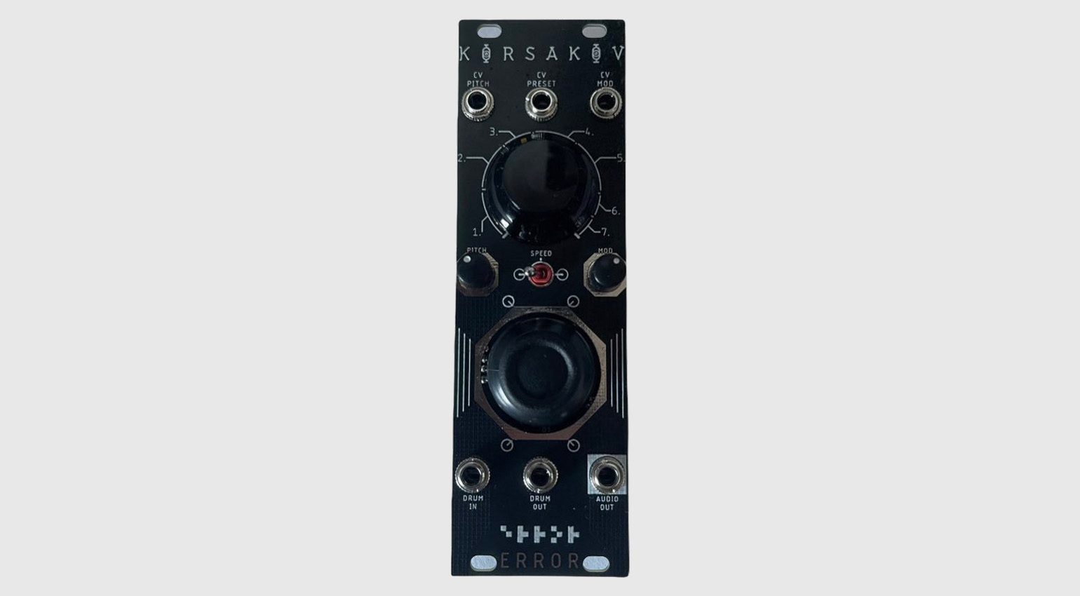 Die Module von Error Instruments sind oft nicht leicht zu beschreiben und dieses hier ist keine Ausnahme. Laut Hersteller ist Korsakov ein Drum- und Percussion-Modul, wobei die Klangbeispiele im unten verlinkten Video eigentlich eher an Drones erinnern. Jedenfalls stecken sieben verschiedene, digital erzeugte Sounds in dem Modul: Wave LFO, FM Synthesizer, Drone FM Synthesizer, Crush Modulation, Basic OSC, Chiptune OSC und Wavetable. Sie alle lassen sich in zwei verschiedenen Geschwindigkeiten abspielen.