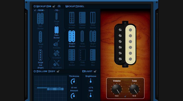 Die grafische Benutzeroberfläche ist sehr übersichtlich und selbsterklärend aufgebaut. Hier findet sich wohl jeder zurecht. Ein weiterer Vorteil des Plug-ins ist der nachträgliche Austausch eines Gitarrensounds in einem schon fertig aufgenommenen Arrangement. Hier könnt ihr zwischen verschiedenen Pickups wählen (Single Coil: single hot, vintage, modern, active, tele, neck+mid, bridge+mid, P90, P90J; Humbucker: vintage, classic, ricky, modern, rails, bright, wide, wide(jazz), jazz box; Piezo, Acoustic, Hollow-bodied). Dazu gibt es natürlich verschiedene Parameter, die ihr noch einstellen könnt (Volume, Tone pot, Brightness und Gain).