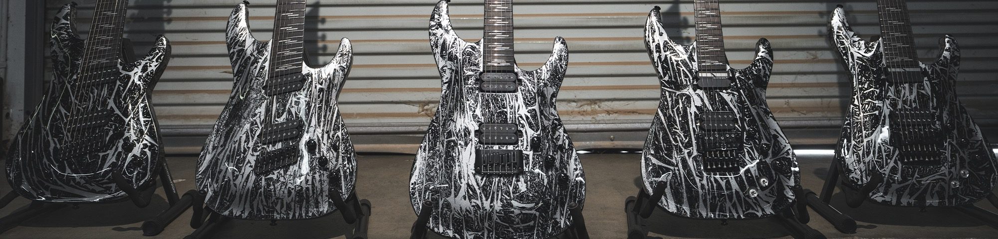 Dazu kommen ein 1500 Floyd Rose Tremolosystem, Grover Rotomatic und durch und durch schwarze Hardware, die die eher aufregende Optik nicht noch konfuser macht. Neu sind die von Schecter designten Sonic Seducer Humbucker in der Bridge-Position und der Sustainiac-Tonabnehmer am Hals.