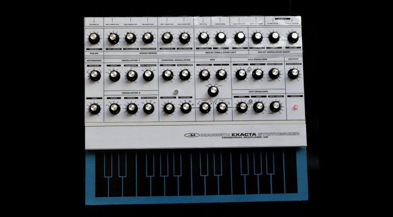 Der Exacta besitzt ein Metallplatten-Touch-Keyboard und ähnelt so bereits sehr stark dem Elements. Er bietet zwei Oszillatoren und einen LFO, der wegen seiner Bezeichnung „Control Oscillator“ vermutlich FM-Klänge ermöglichen wird und entsprechend schnell sein dürfte. Interessanterweise handelt es sich bei dem Filter um eines mit Multimode. Bei den bisherigen Synthesizern von Ken Macbeth müsste das bedeuten, dass es sich hier um eine Variante mit 12 dB pro Oktave handeln könnte. Die weiße Farbe erinnert ein wenig an den weißen Odyssey, was jedoch auch einfach Zufall sein könnte. Schließlich gibt es auch andere Synthesizer von Macbeth in diesem Look und auch einige Prototypen die einfach aus praktischen Gründen weiß gehalten sind. Wie das Papier, auf dem die provisorische Beschriftung aufgetragen ist.