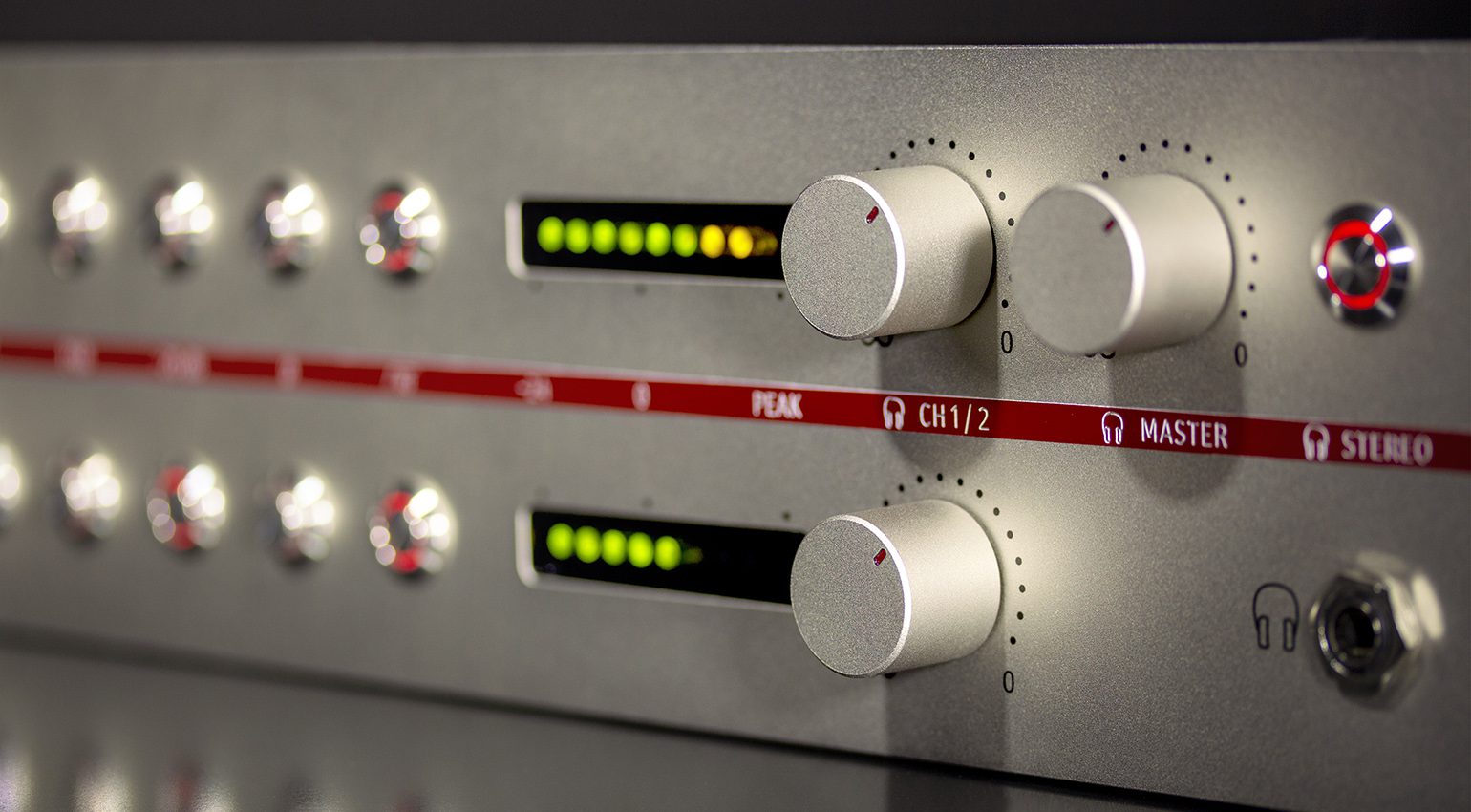 Interessant wird es ganz rechts. Der V 402 bietet eine integrierte Monitoring-Funktion, was beispielsweise beim Suchen der richtigen Mikrofonposition hilfreich sein kann. Es gibt einen Kopfhörerausgang mit Master-Lautstärkeregler sowie pro Kanal jeweils einen Monitor-Regler. Auch beim integrierten Kopfhörerverstärker hat Neumann nach eigenen Angaben auf einen äußerst sauberen Klang Wert gelegt.