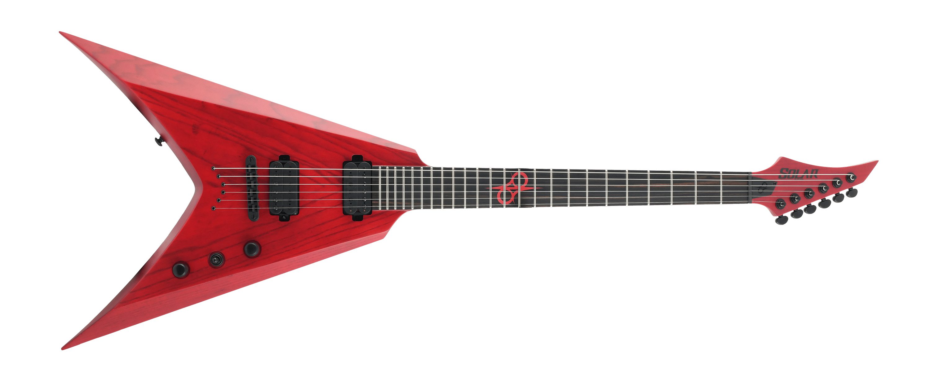 Das neuste Modell von Solar Guitars ist die V2.6 Halloween – und ja, sie ist in V-Form. Der Body ist aus Sumpfesche, der dreiteilige Hals mit Ebenholzgriffbrett und rotem Solar Logo um den 12ten Bund herum. Gestimmt wird mit schwarzen Gover Tunern mit 18:1 Übersetzung an einem gematchten Headstock. Auf der anderen Seite gibt es eine Tune-o-Matic Bridge und String Thru Saitenaufhängung. Klingt auf dem Blatt nach gutem Sustain.