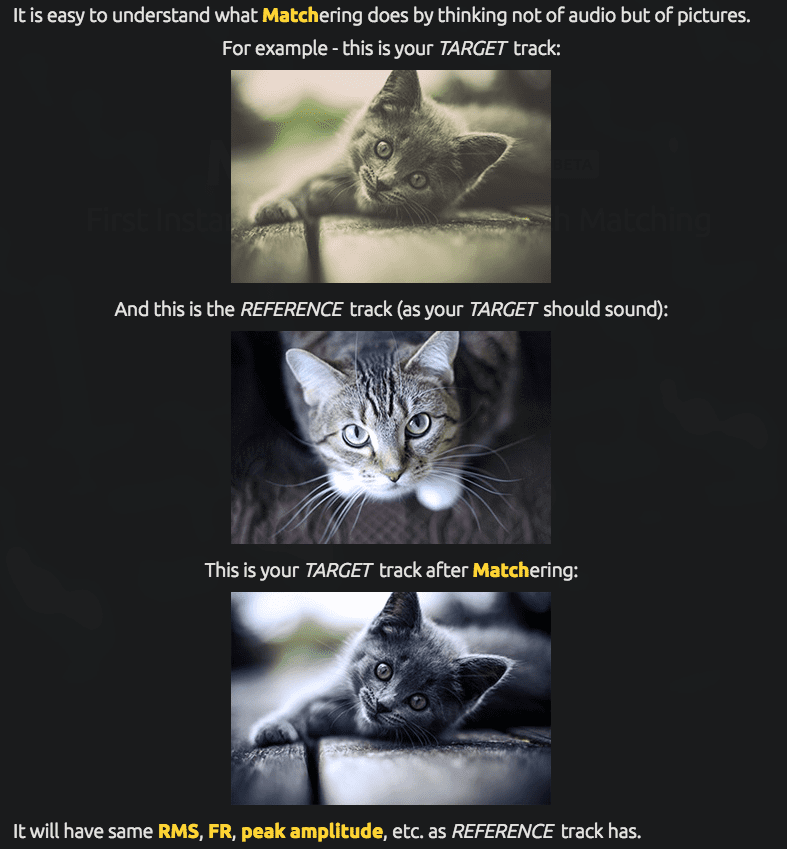 Man kann vorm Mastering angeben, dass der Song anhand eines Referenzliedes in Peak Amplitude, RMS und Frequenzgang angepasst wird. Heißt: Ihr hättet gern einen Song, der nach Metallicas neustem Machwerk klingen soll, soll es damit ohne teure Studios und Engineers klappen. So beschreibt es der Hersteller selbst in Bildern – Katzen versteht jeder! ;)