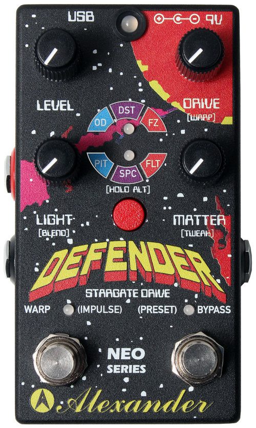 In der Vergangenheit hat Alexander Pedals schon ein paar abgedrehte Pedale vorgestellt. Nun kommt mit dem Defender ein Pedal für Gitarre und Synthesizer, das neben den ganz kranken Sounds auch sehr brauchbare zaubern kann. Der Untertitel Stargate Drive hat leider weniger Bedeutung, passt dafür hervorragend zur Grafik.