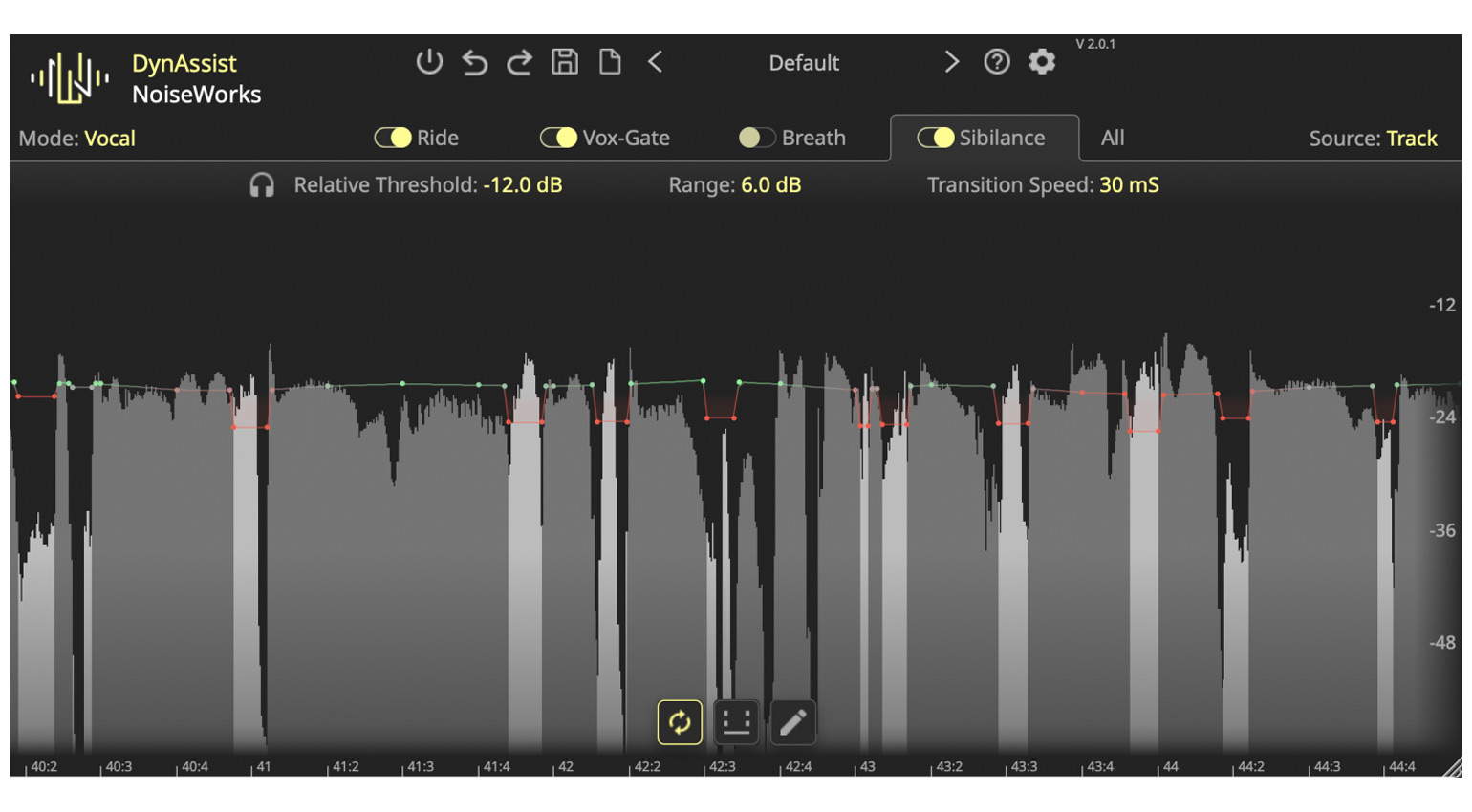 NoiseWorksAudio bietet mit DynAssist ein Plugin an, dass diese Aufgabe bereits mit den Standardeinstellungen sehr überzeugend erledigt und dabei genug Optionen für Feinabstimmungen bietet. Zudem sind hier auch Werkzeuge zum Reduzieren von Atemgeräuschen und scharfen S-Lauten enthalten. Gesang und Sprache klingen nach der Bearbeitung mit einem De-Esser in den meisten Fällen nämlich deutlich klarer.