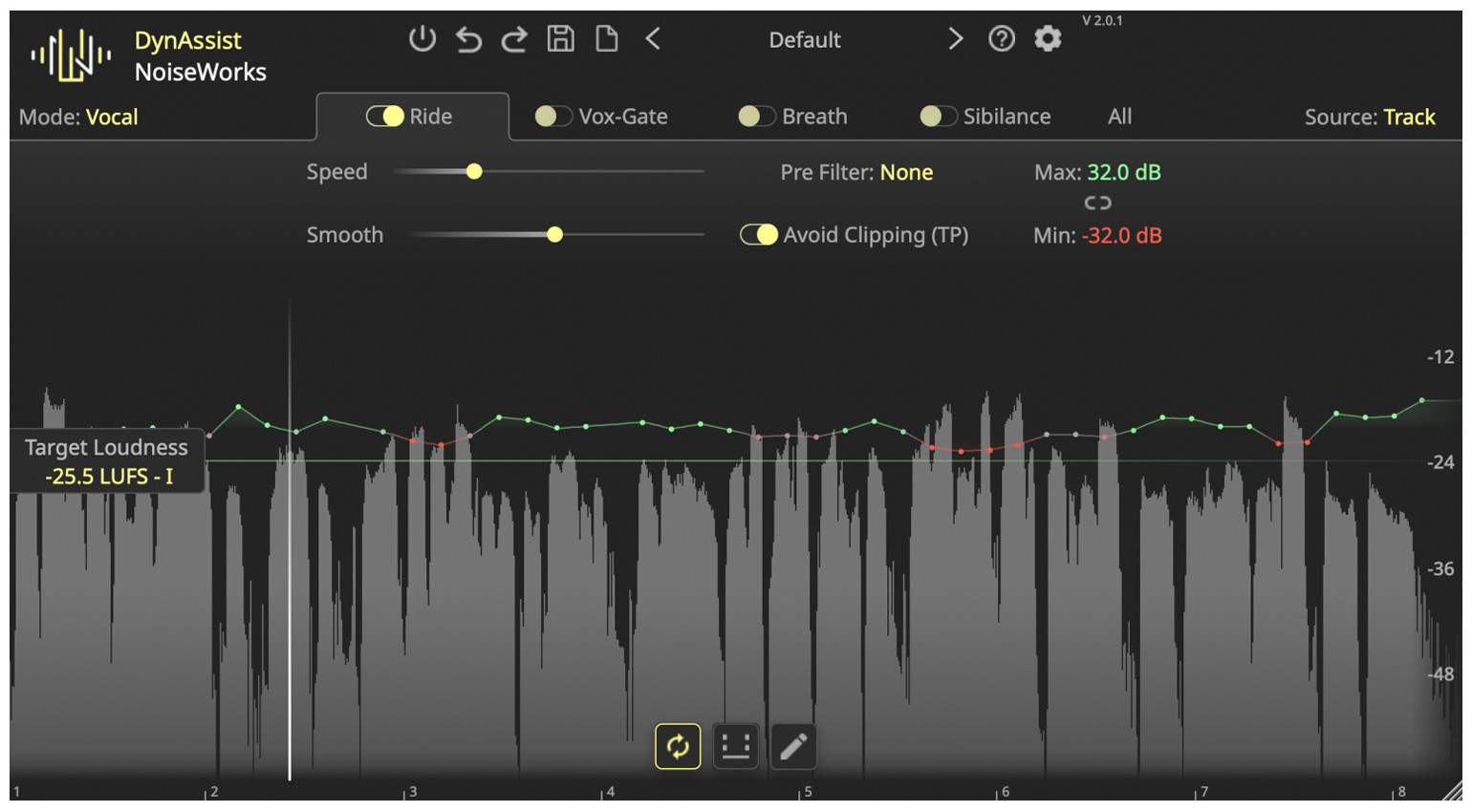 Natürlich kannst du auch Feinabstimmungen vornehmen. Mit der „Ride“ genannten Sektion des Plugins lässt sich zunächst der Zielwert der Lautstärke – also die Target Loudness – einstellen. Mit den Speed- und dem Smooth-Reglern beeinflusst du, wie subtil oder stark das Vocal-Riding ausfällt. Avoid Clipping sorgt dafür, dass das Riding niemals zu stark ausfällt und das Signal dadurch verzerrt. Deshalb sollte diese Funktion eigentlich immer aktiviert sein.