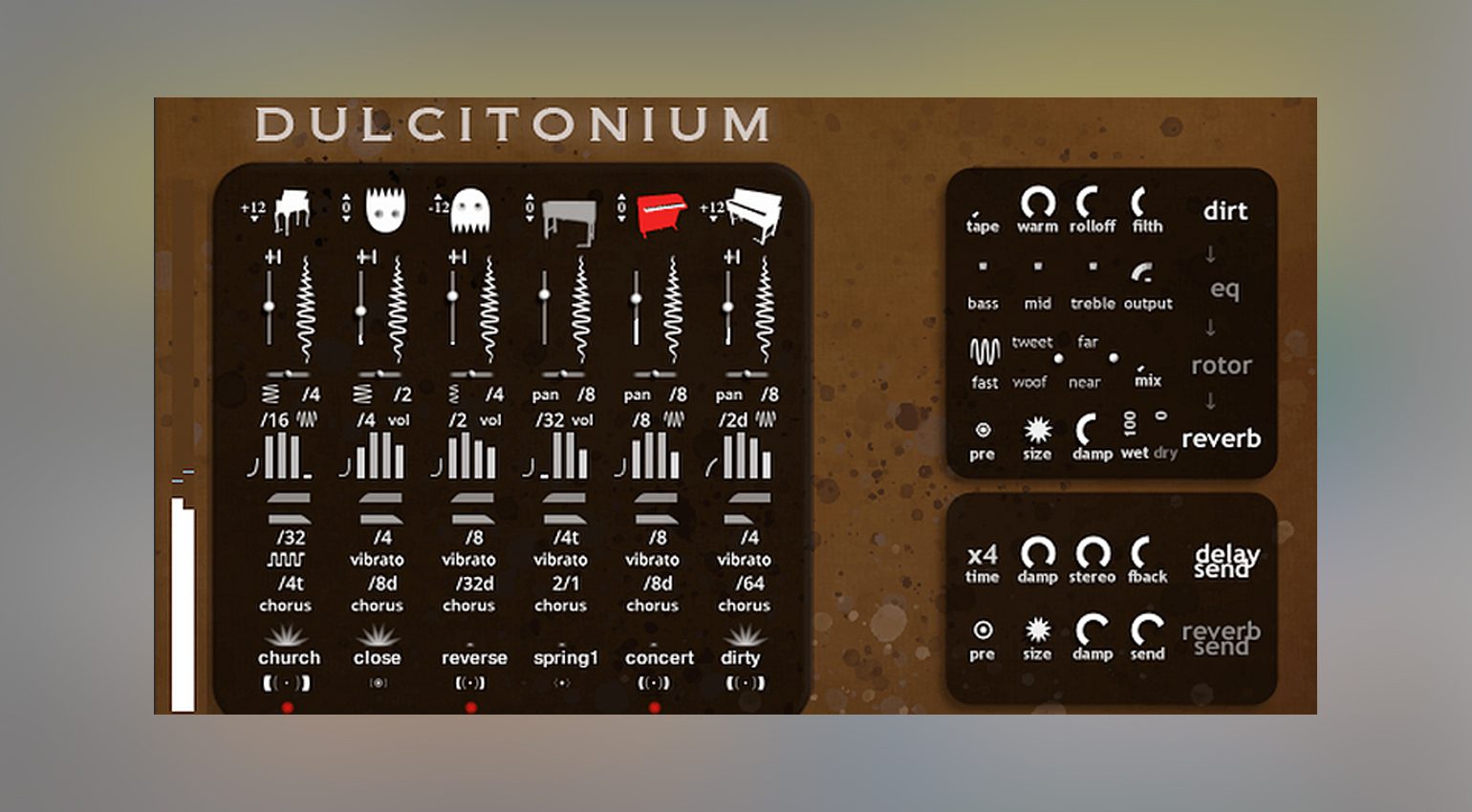 Wiki hilft: Ein Dulcitone (auch Typophon genannt) ist ein schottisches Tasteninstrument, bei dem Stimmgabeln durch Filz-Hämmerchen angeschlagen werden. Das reicht hier als Einführung, Details könnt ihr hier nachlesen. Dulcitonium virtualisiert dieses Instrument jetzt quasi in Kontakt und erweitert es um ein paar Tricks, die beim Original weder vorhanden noch möglich sind. Dazu gehören zum Beispiel Sachen wie Note Jitter, das zufällig das On/Off-Timing der Noten manipuliert und das Tuning zwischen den sechs zur Verfügung stehenden Artikulationen beeinflusst. Ihr könnt auch feste Skalen auswählen, denen dann die gespielten Noten und Akkorde zugeordnet werden. Panning, Modulation der Lautstärke, Vibrato und Chorus können zum Tempo des Hosts synchronisiert werden. Pro Instrument bekommt ihr 24 Convolution-Reverbs, außerdem stehen vier frei belegbare Insert-Effekte und zwei Send-Effekte zu eurer Verfügung.