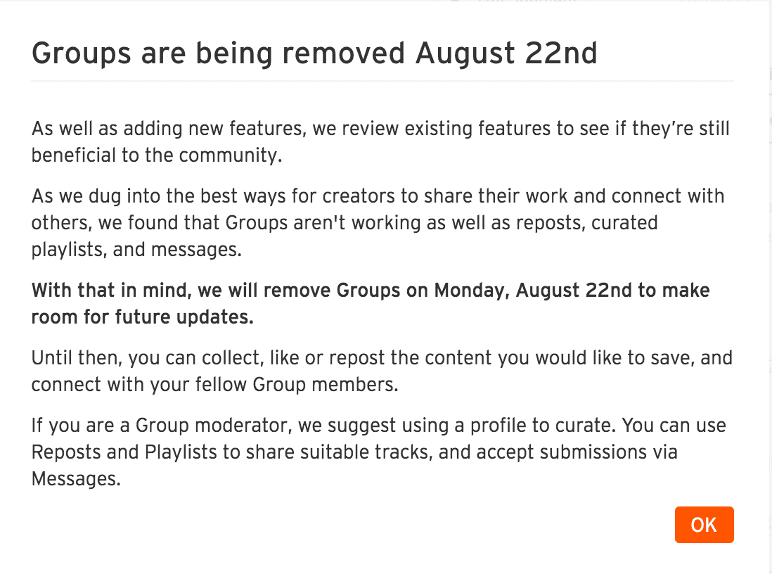 Ich fand die Gruppen ja ganz nützlich, um Lieder schnell und gezielt bei Interessenten bekannt zu machen. Sie hätten allerdings auch verbessert werden können, z.B. mit einem Timeout bei Inaktivität. Einfach entfernen, ohne eine Alternative anzubieten, finde ich blödsinnig. Ich glaube auch nicht, dass Soundcloud dadurch enorme Ressourcen einspart. Und der Vorschlag, nun wie ein Kurator Playlists zu pflegen (?), ist doch albern. Es gibt keine Submissions zur Playlist, der „Kurator“ muss alles manuell machen. Eine völlige Fehlentscheidung.