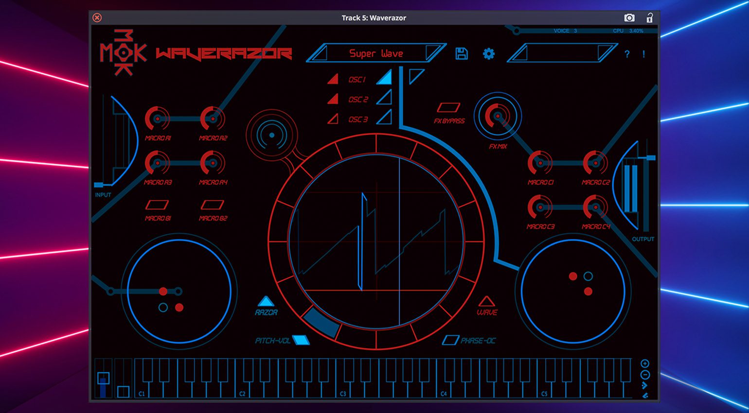 Waverazor von MOK ist ein einzigartiger Software Synthesizer mit Möglichkeiten, die in keinem anderen Klangerzeuger zu finden sind. Dazu ist die grafische Benutzeroberfläche mehr als spektakulär und beeindruckend. Ein weiteres Alleinstellungsmerkmal ist, dass der Klangerzeuger in ein Hardware-Modul transferiert wurde (siehe hier). Die Klangerzeugung besteht aus „geslicten“ Oszillatoren, die wiederum miteinander interagieren. Und das aber mit einer wirklich intelligenten Art und Weise, so dass sehr interessante und spannende Sounds entstehen. Dieser Synthesizer ist sicherlich ein großartiges Instrument für Sounddesigner und Klangbastler.