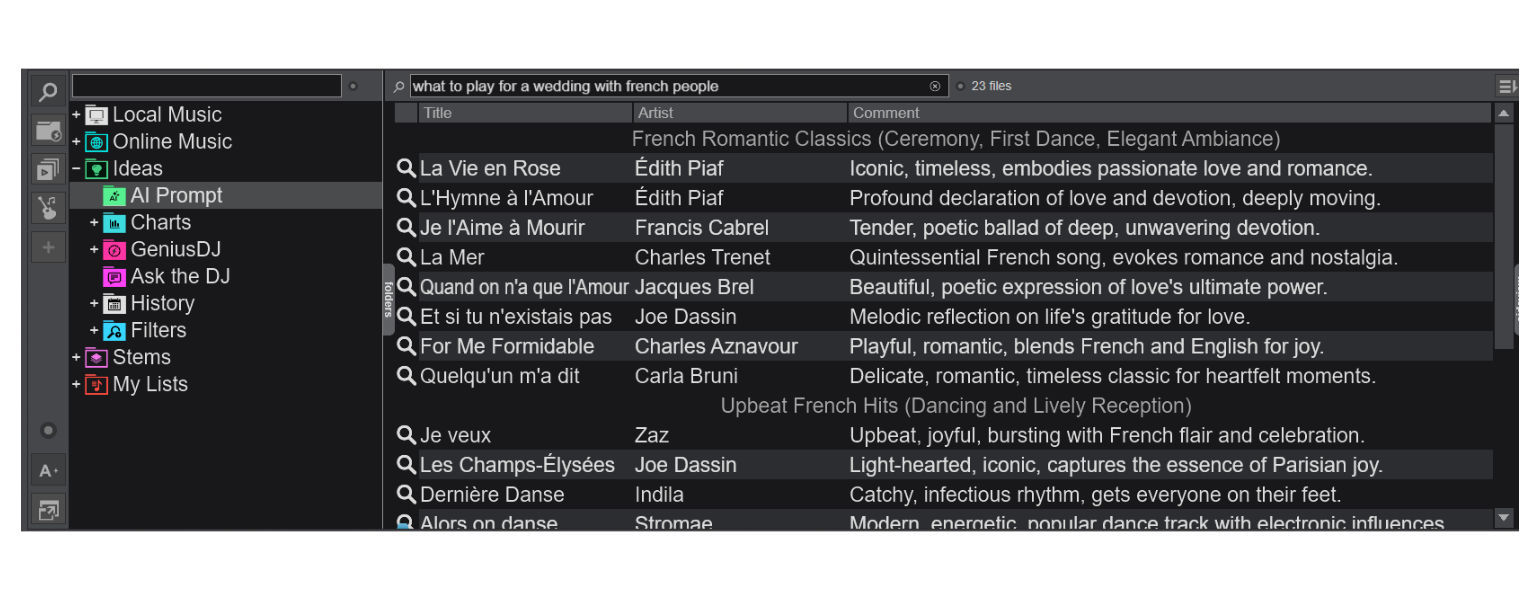 AIPrompt Folder heißt ein weiteres neues Feature in VirtualDJ 2026: Damit bekommst du die Power von LLM (Large Language Model) nun direkt in der DJ-App. Quasi ChatGPT in VirtualDJ! Aber natürlich nur ein kleines bisschen, denn du erhältst nur einen kleinen AI-Assistenten, der dir hilft, Tracks schneller zu finden, diese zu beschreiben und Listen mit Empfehlungen zu erstellen. Klingt das irgendwie gruselig? Nutzen musst du diese Funktion natürlich nicht! Die Beschreibungen in dem vom Hersteller gezeigten Bild wirken auf ihre Art irgendwie etwas komisch. Übrigens gibt’s diese Funktion nur für User mit einer Pro-Lizenz!