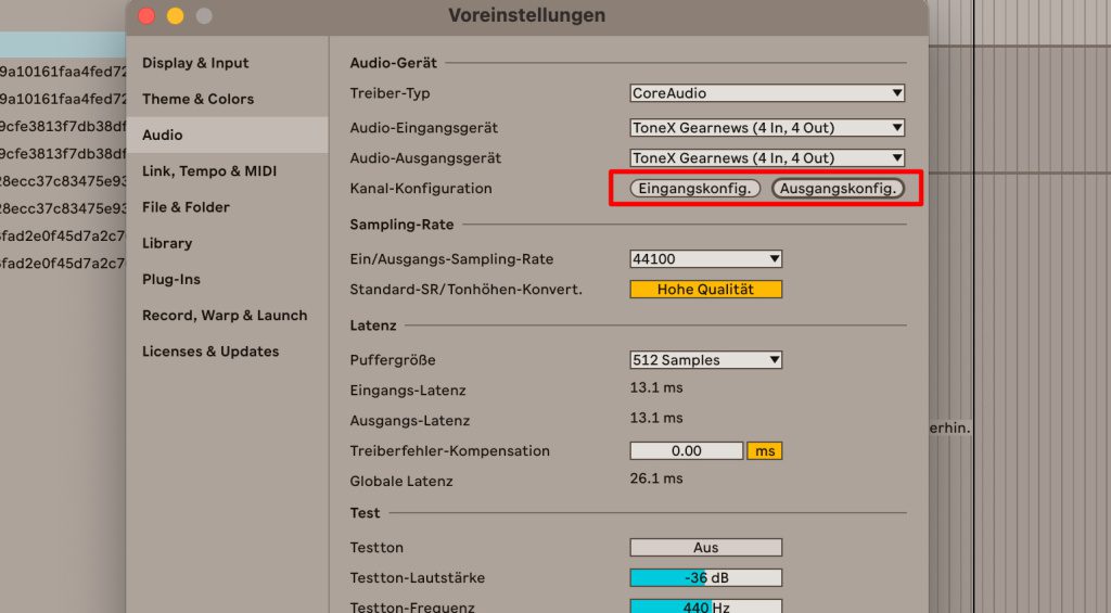 ToneX darf während dieses Prozesses noch nicht geöffnet sein. Öffnet jetzt eure DAW (ich habe Ableton Live dafür genutzt). Wählt in den Audioeinstellungen den neuen Device „ToneX Gearnews“ also Eingang und Ausgang. Dazu müsst ihr eventuell darunter bei den Kanalkonfigurationen noch jeweils Eingang 3 und 4 und Ausgang 3 und 4 aktivieren.
