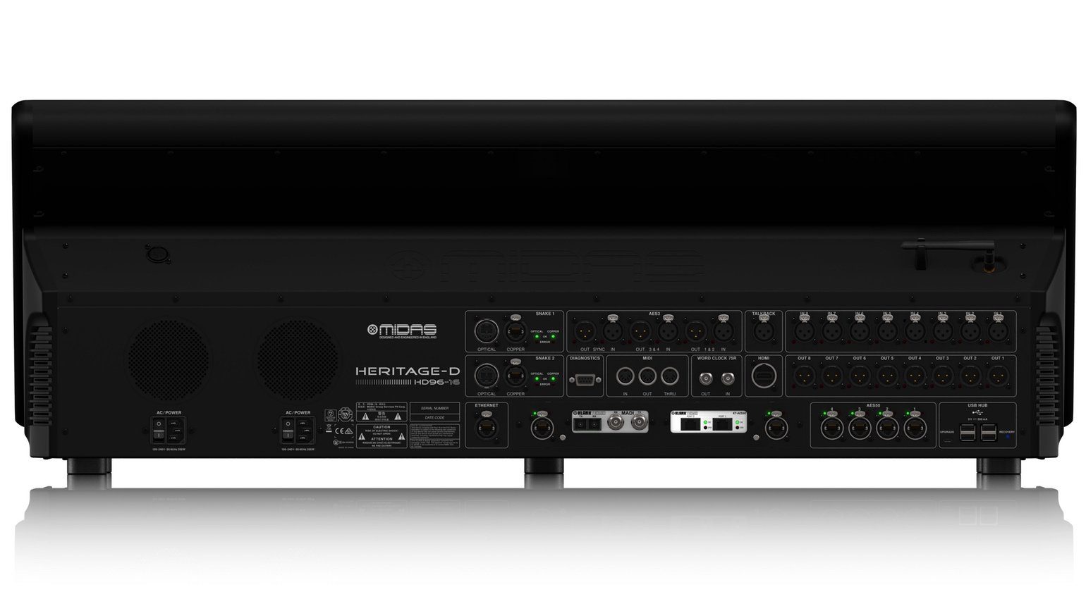Da die Bilder sowohl die Vorder- als auch Rückseite zeigen, kann man eigentlich den Umfang dieses Pultes schon fast komplett sichten. Das Midas Heritage-D 96 – 16, bzw. HD96-24-CC-TP, erinnert optisch zumindest entfernt an ein M32. Es bietet 8 XLR-Inputs und 8 XLR-Outputs, Anschlüsse für AES3, AES50, MIDI, Word Clock, MADI, 4x USB (Hub), HDMI und zwei (vermutlich) unabhängige Anschlüsse für die Stromversorgung. Eventuell einer als Backup.