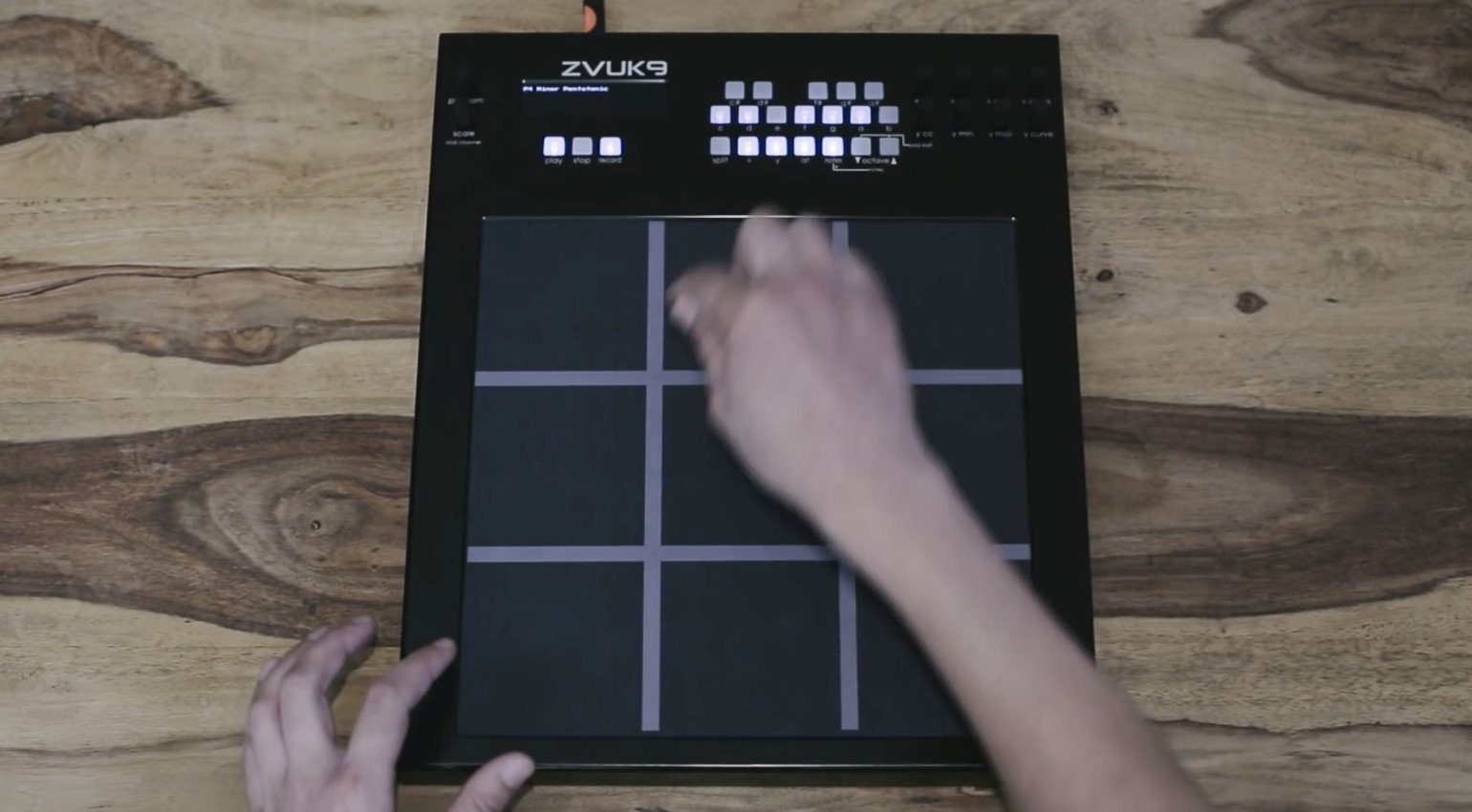 Das große Touchfeld des Zvuk9 ist durch hellgraue Linien in neun Felder eingeteilt, bei dem ihr entweder eure Parameter, die ihr regeln wollt, über ein Feld oder auf kleineren neun verteilen könnt. Das Gehäuse besteht aus Aluminium. Der Controller verfügt ebenso über MIDI- und einen USB-Anschluss. Standalone wird Zvouk9 über die integrierten Buttons gesteuert. Die Parameter hierzu zeigt der kleine Bildschirm an dem Gerät selbst. Die Touch-Oberfläche versteht sogar Velocity und Aftertouch!